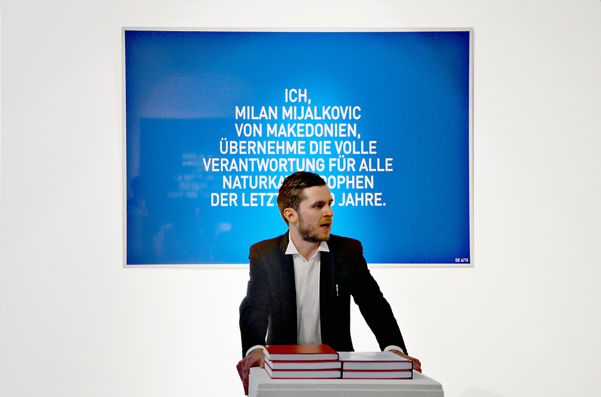 In the course of the opening, selected natural disasters were auctioned. A certificate for the highest bidder attests the individual responsibility for the disaster. All money was raised to the benefit of the unoriented progress, the sponsorship of art.