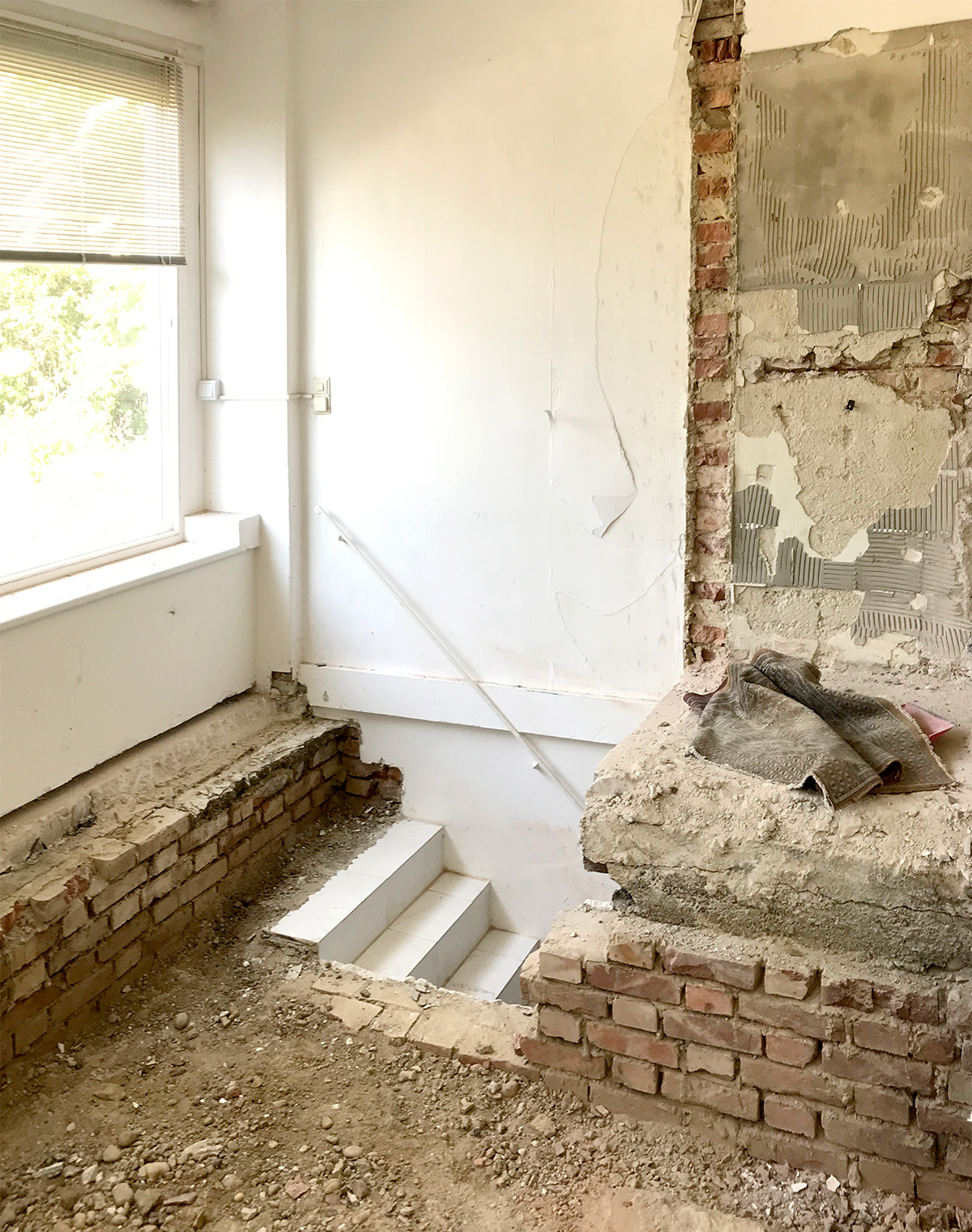 Kaminmöbel, Küche und Kellerstiege werden zu drei neuen Schwerpunkten im ansonsten entleerten Erdgeschoss. Die Zubauten der letzten Jahrzehnte verbinden sich zur Enfilade, die sich so für neue Nutzungszusammenhänge öffnet. Bestehende und neue Durchbrüche zwischen Althäusern und Zubauten werden sichtbar gemacht. Sichtziegel, weiße Stahlträger und Einbauten in enzianblau markieren diese Etappe der Veränderung.